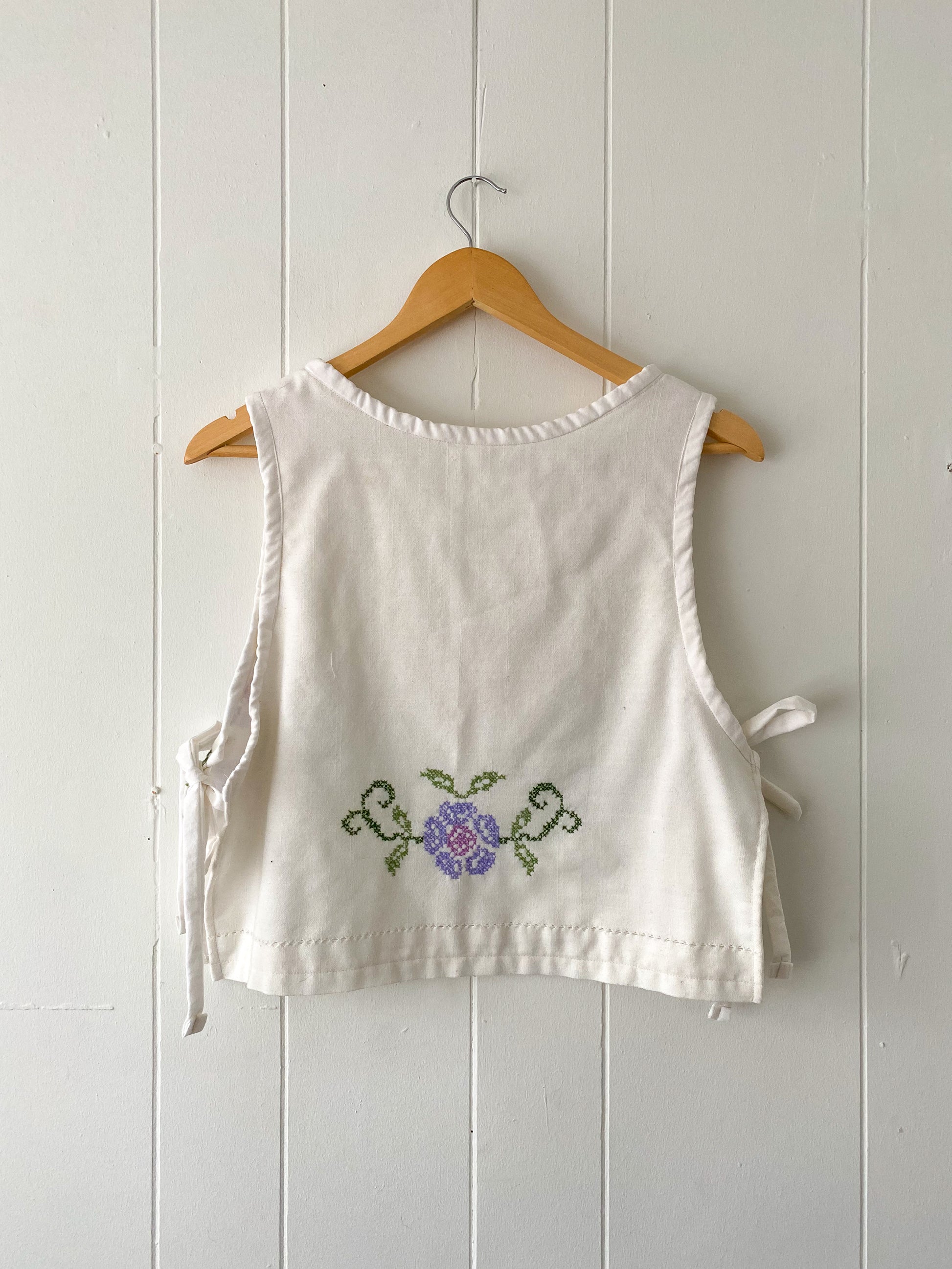 Made from a vintage embroidered tablecloth. Please make note of the measurements below.