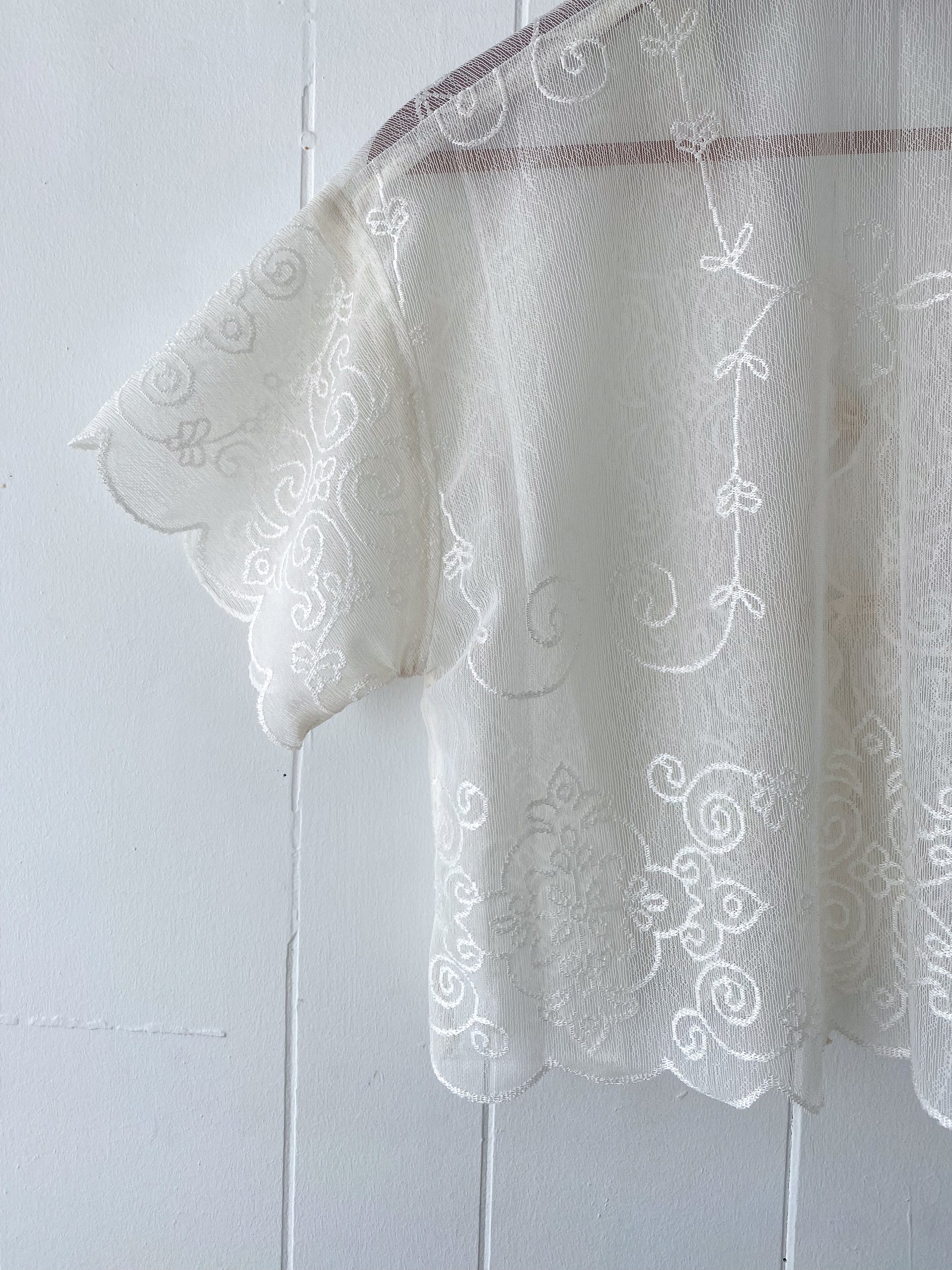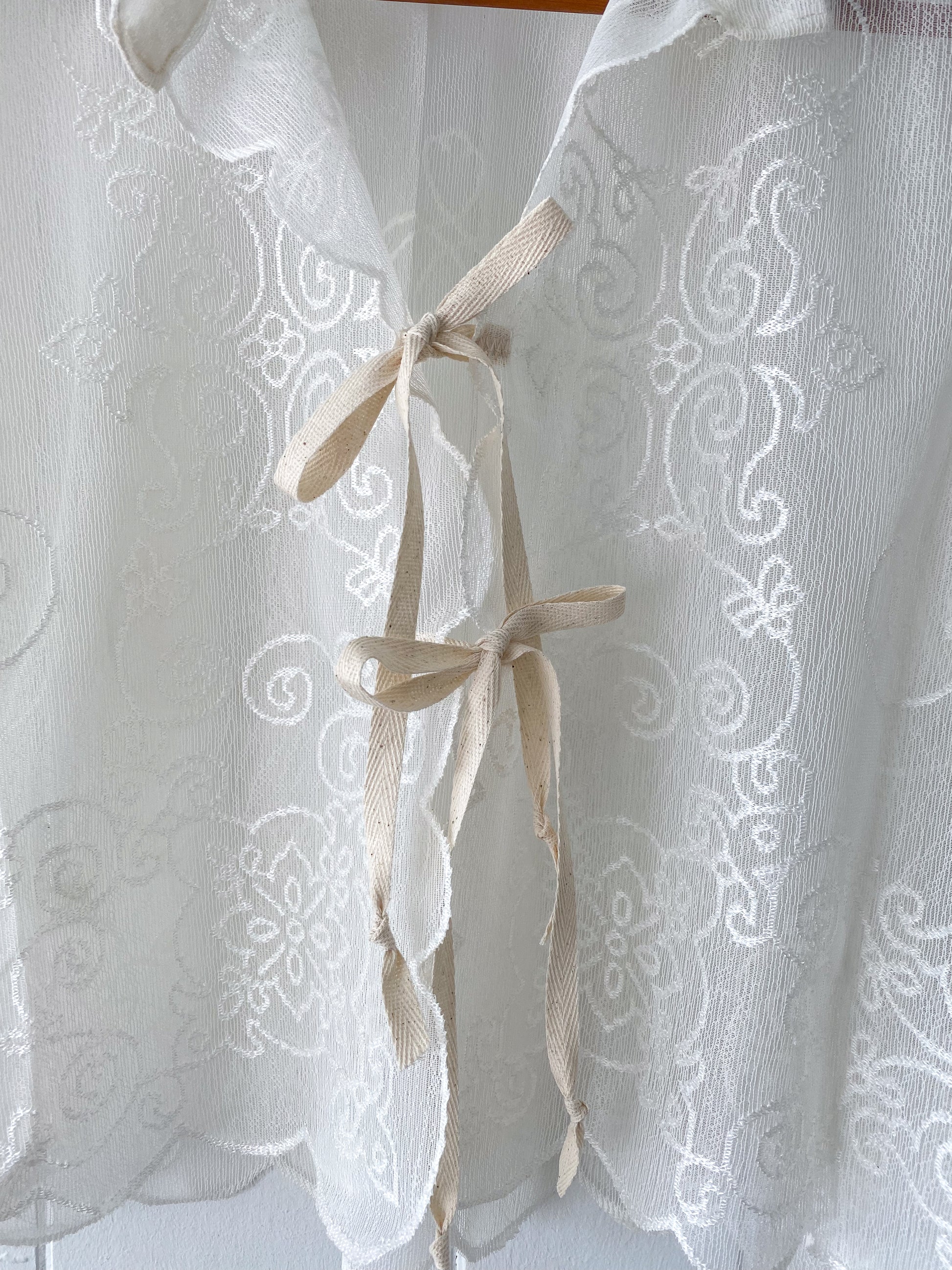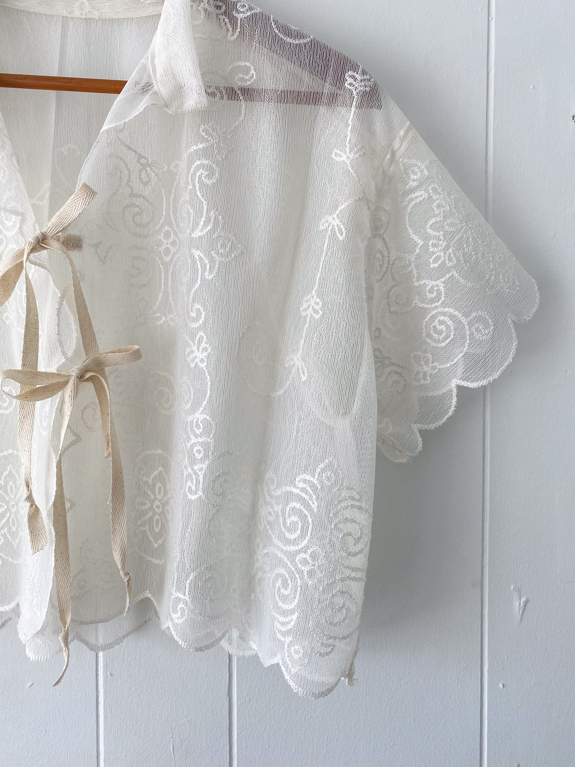 (S/M) Upcycled Tie Front Lace/Mesh Blouse