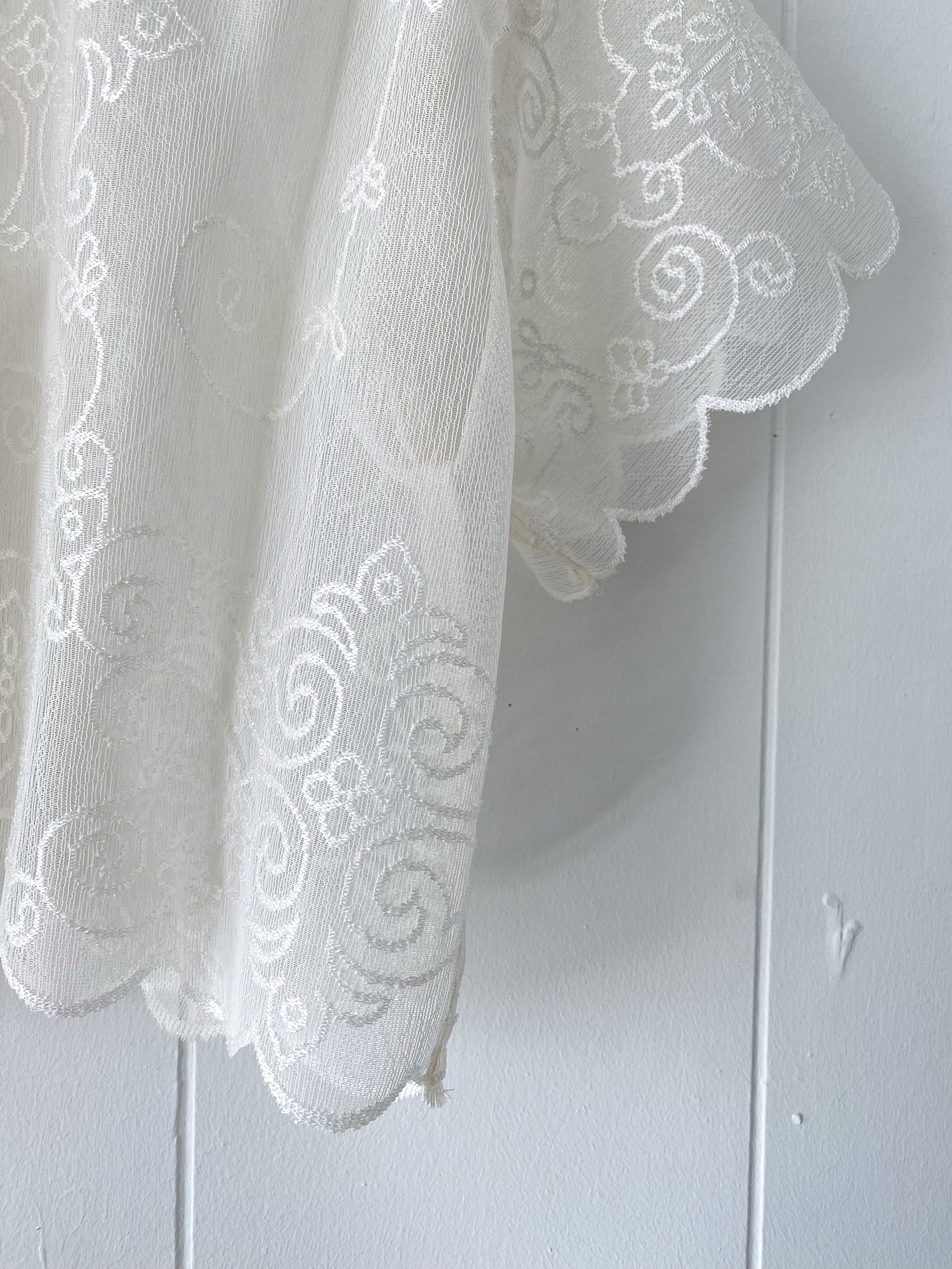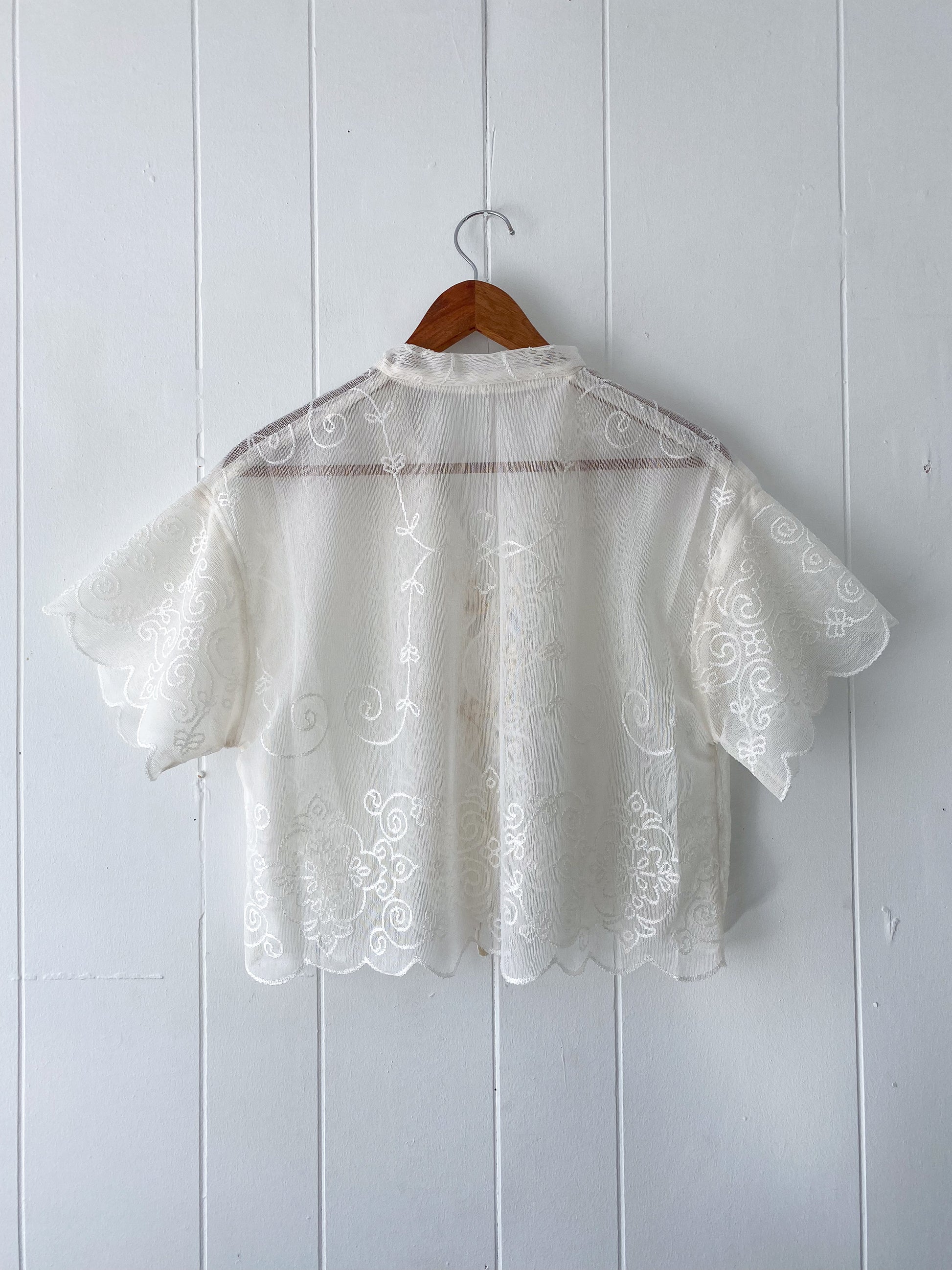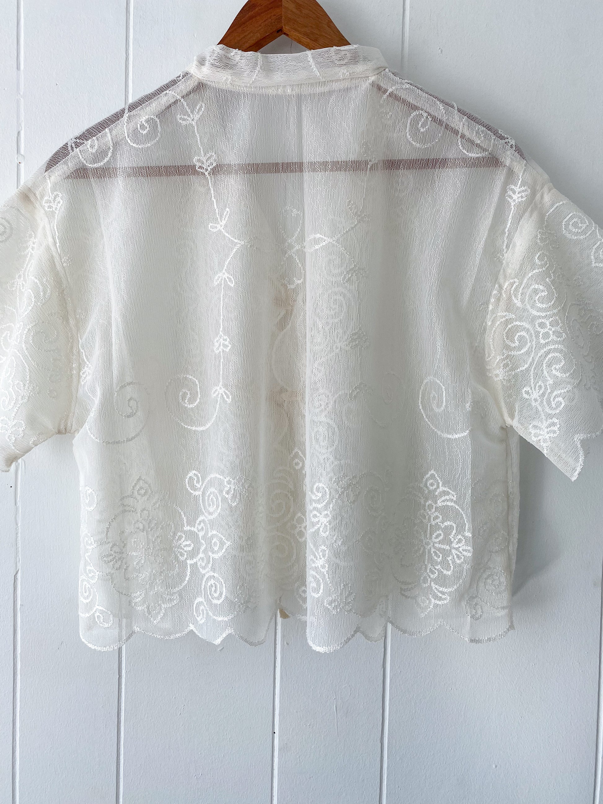 (S/M) Upcycled Tie Front Lace/Mesh Blouse