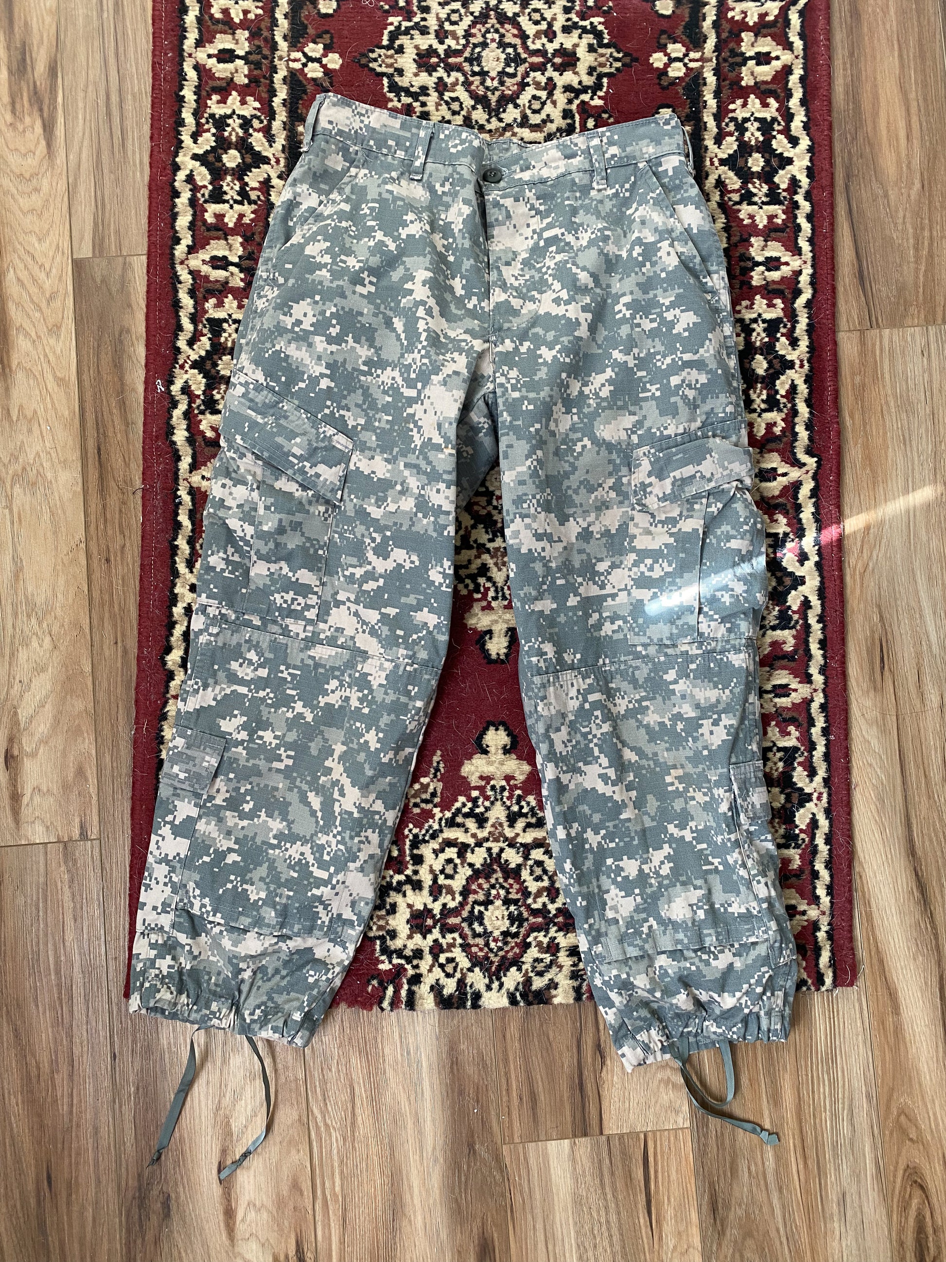 Button closure. Inner waist drawstring to tighten as desired. Cargo pockets.