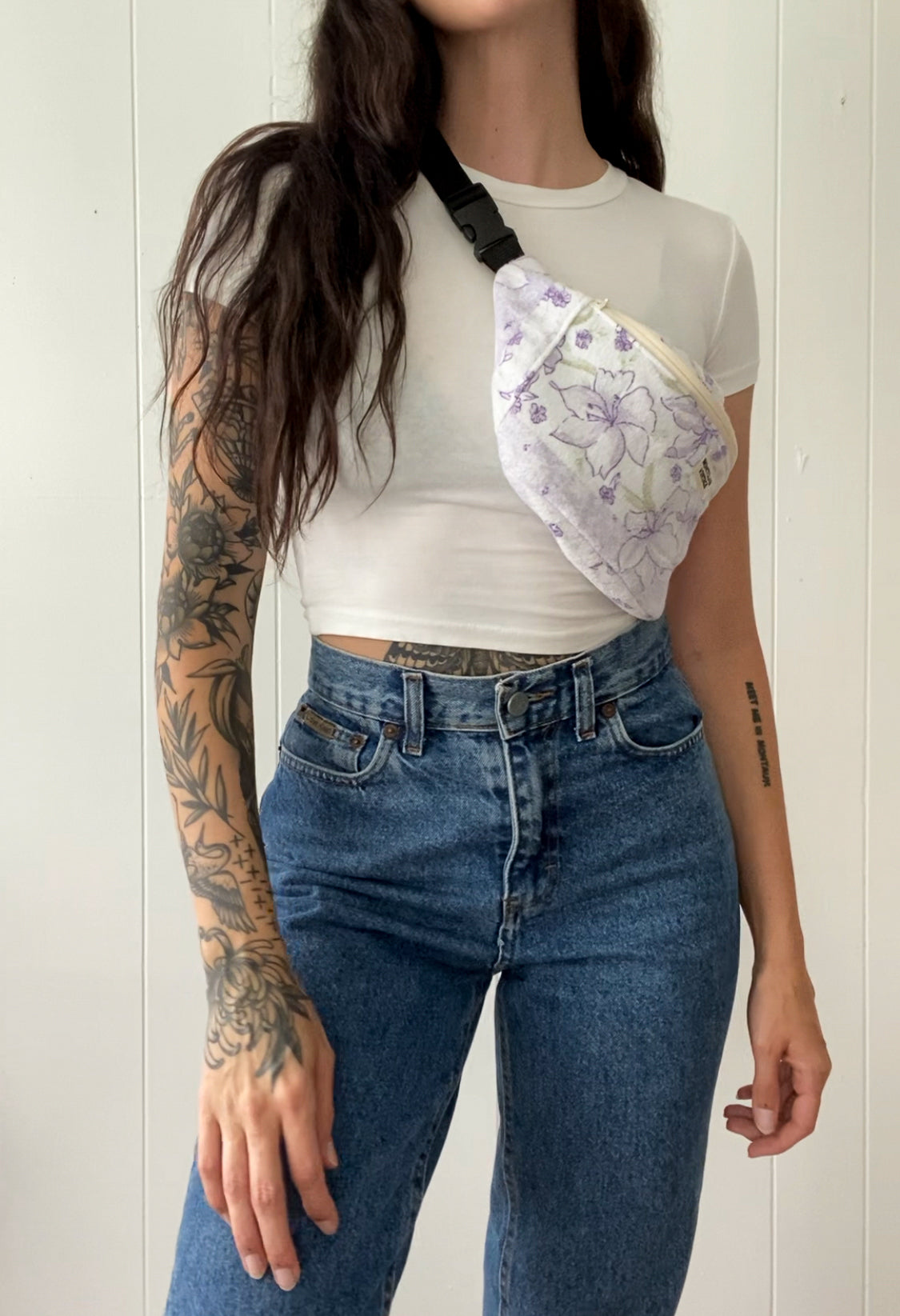Made with the off-cuts of a vintage flannel nightgown. Lined with a vintage floral quilt.