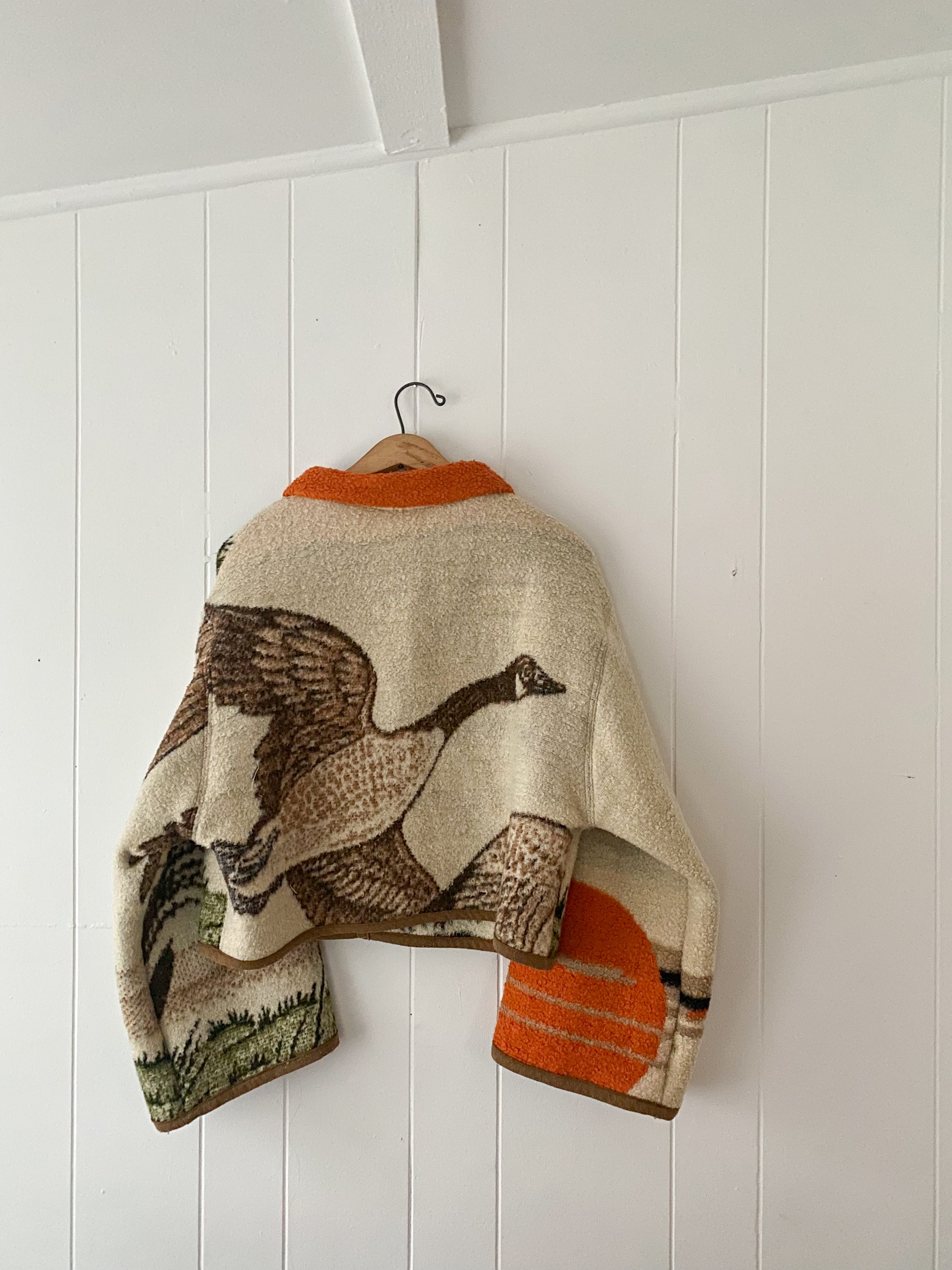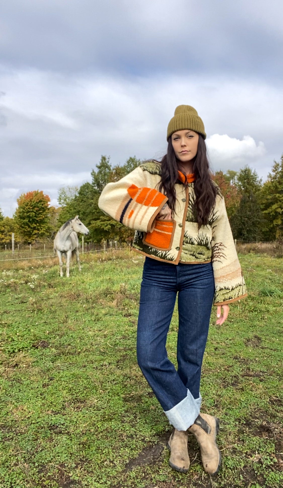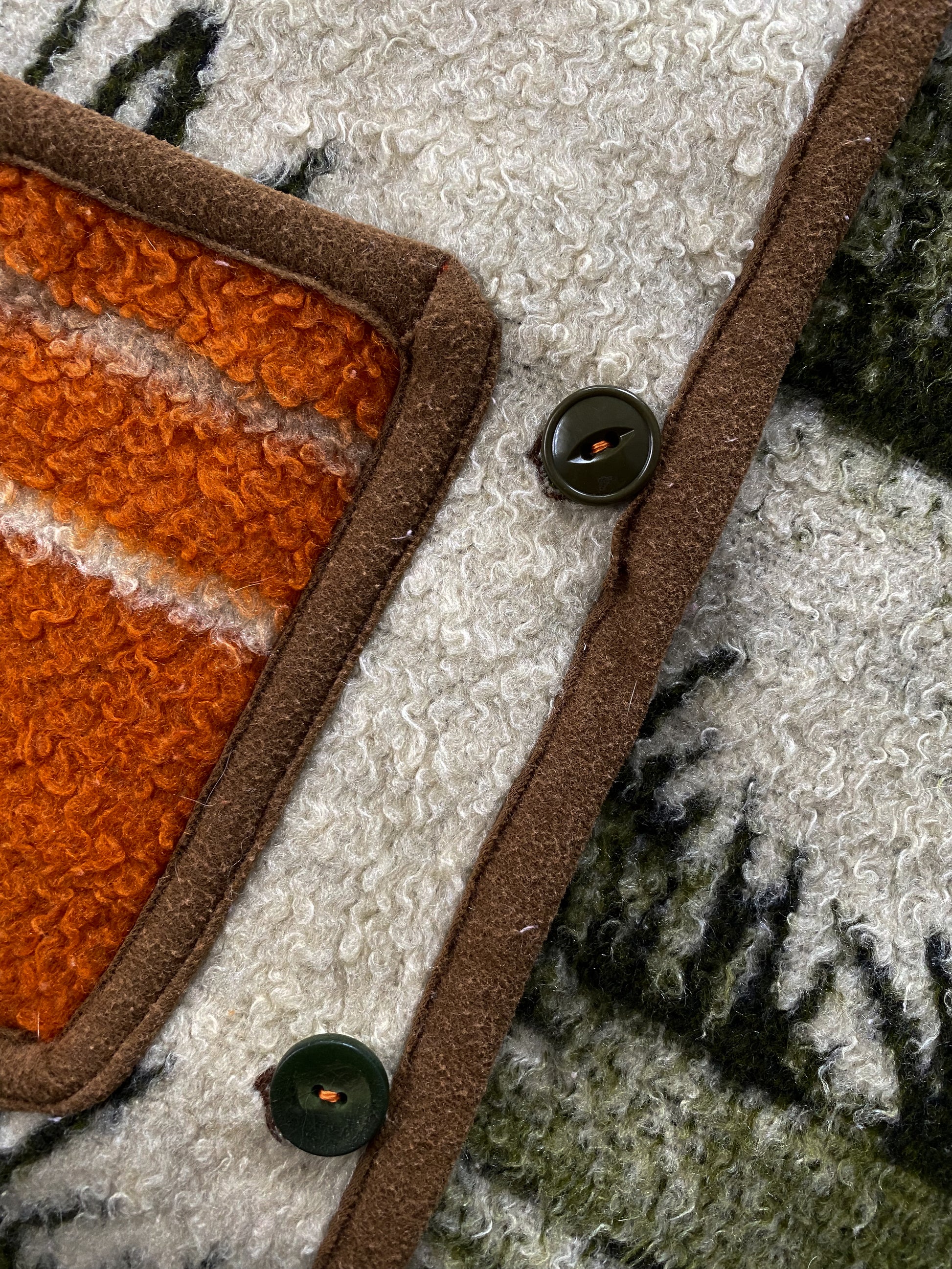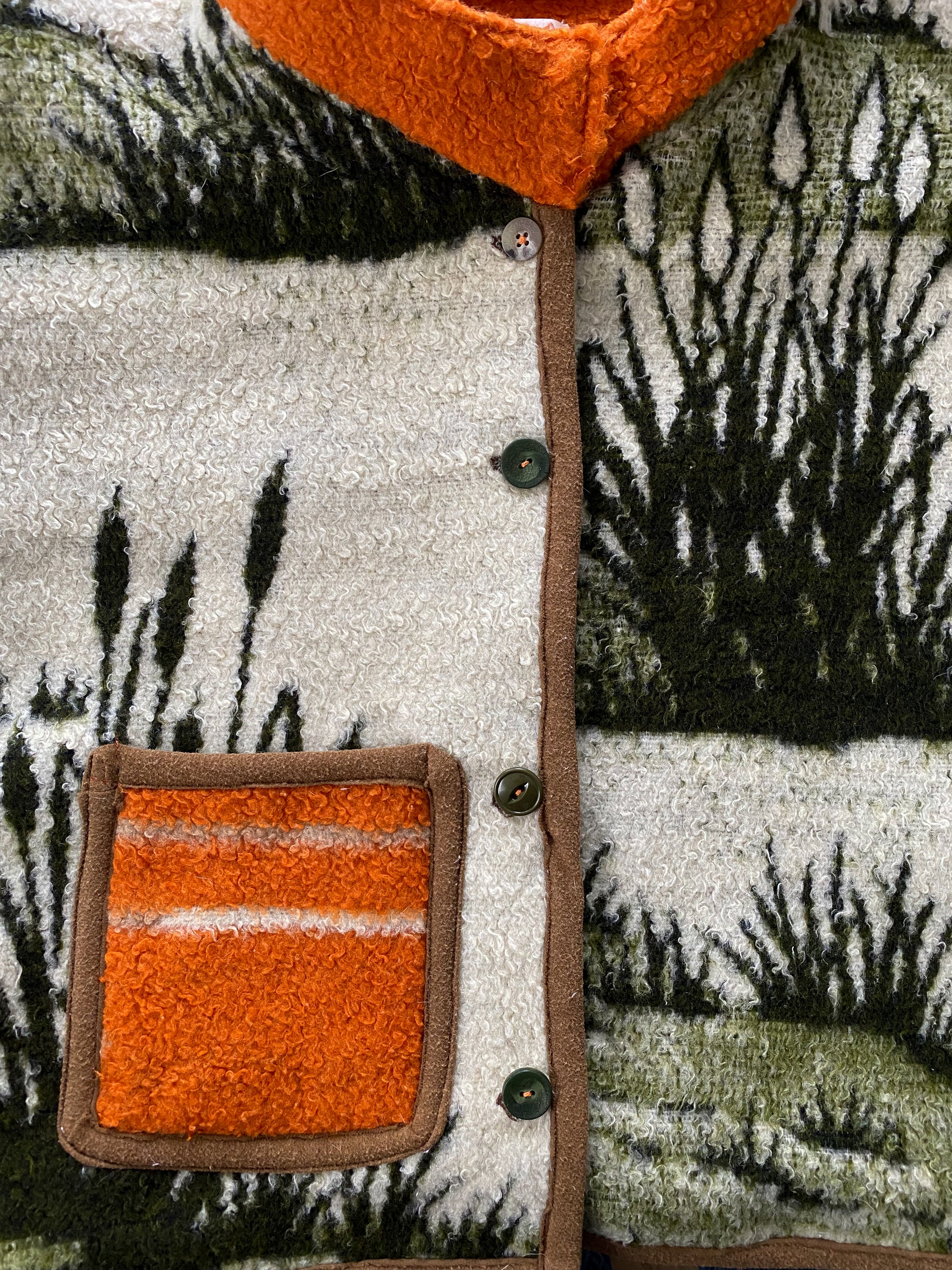 Made from a vintage Biederlack blanket. Acrylic and Polyester blend. Very soft and cozy! :)