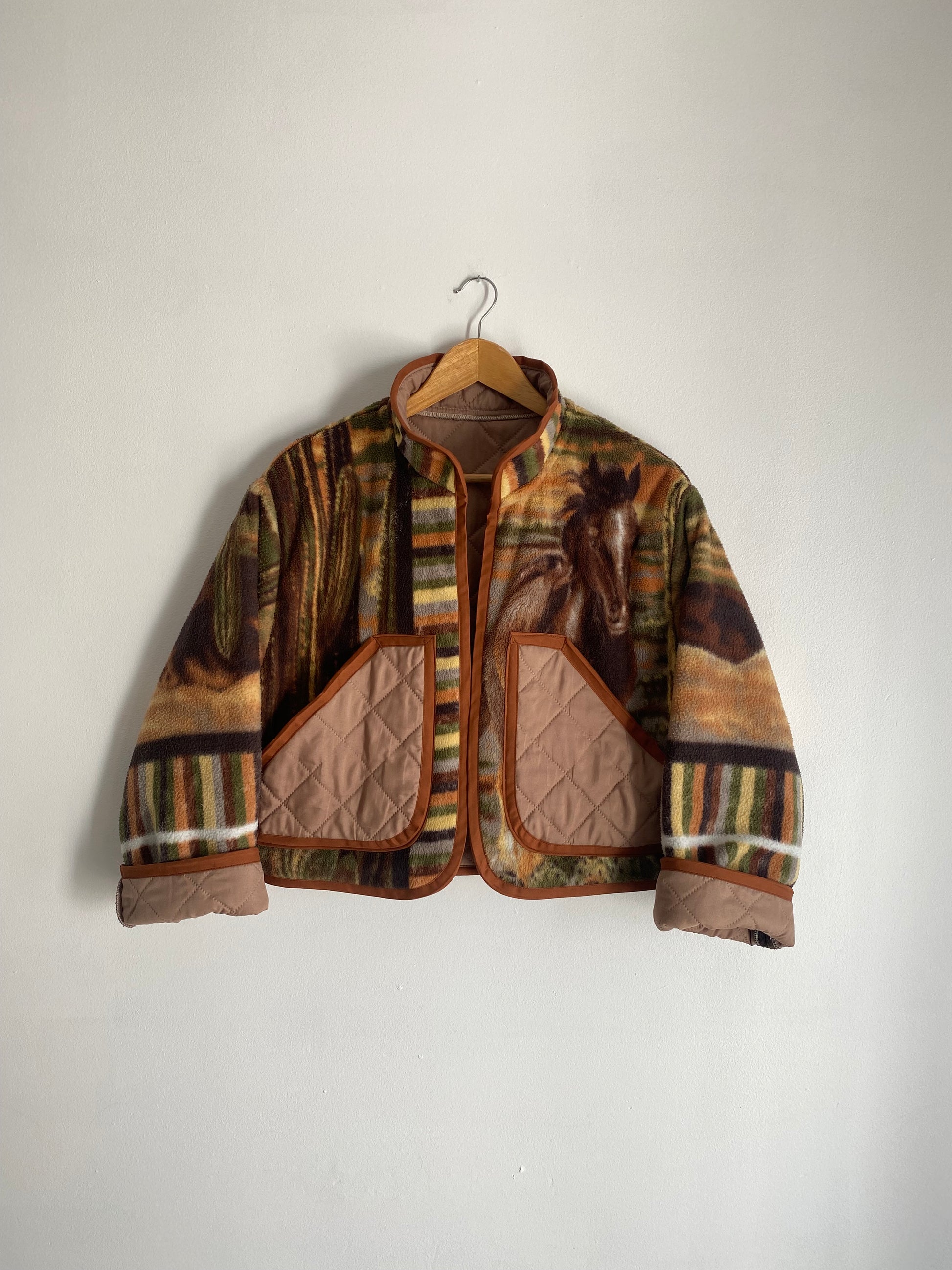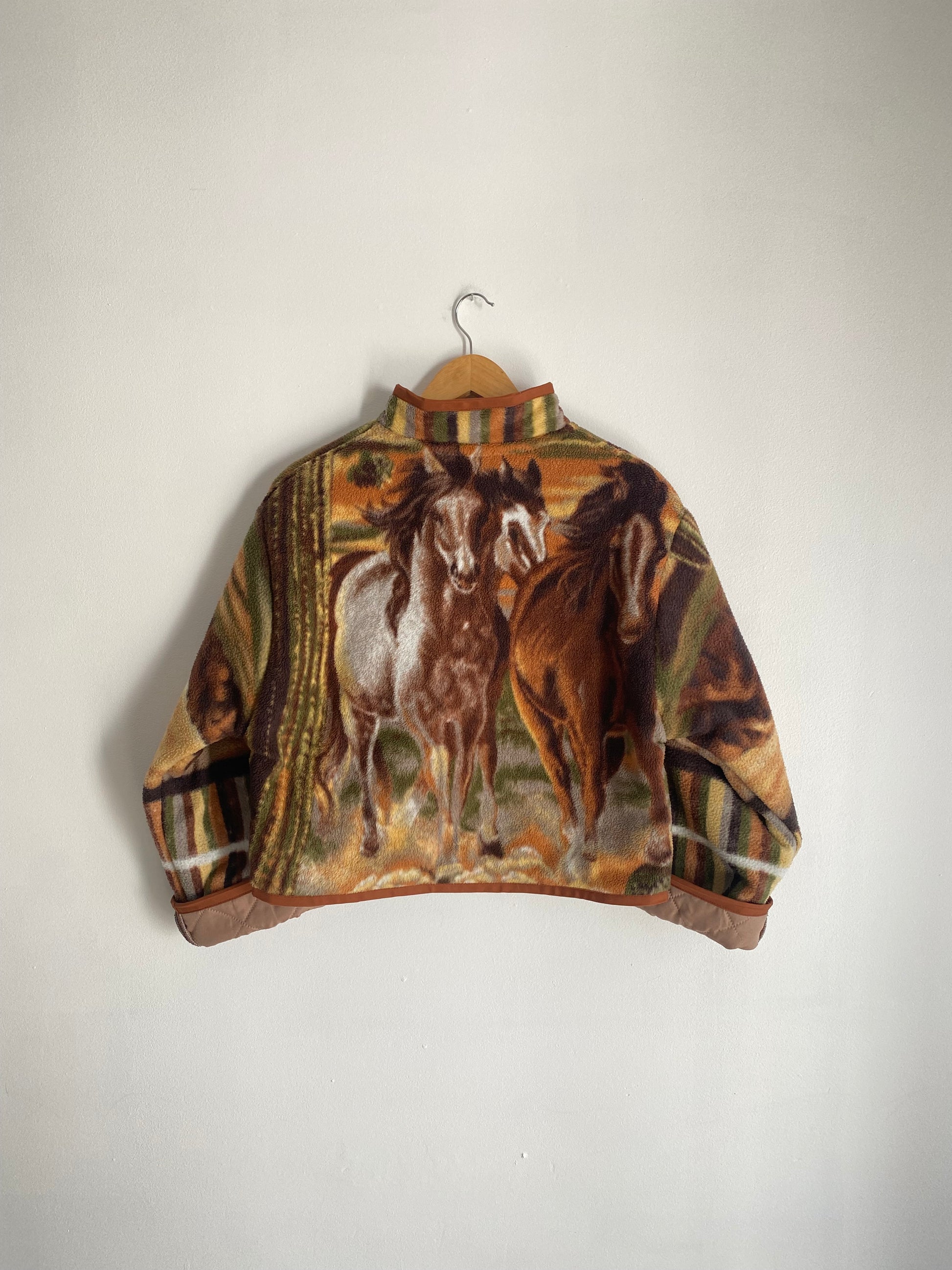 Made from a fleece, running horses fabric panel. Lined and accented with a quilted material.
