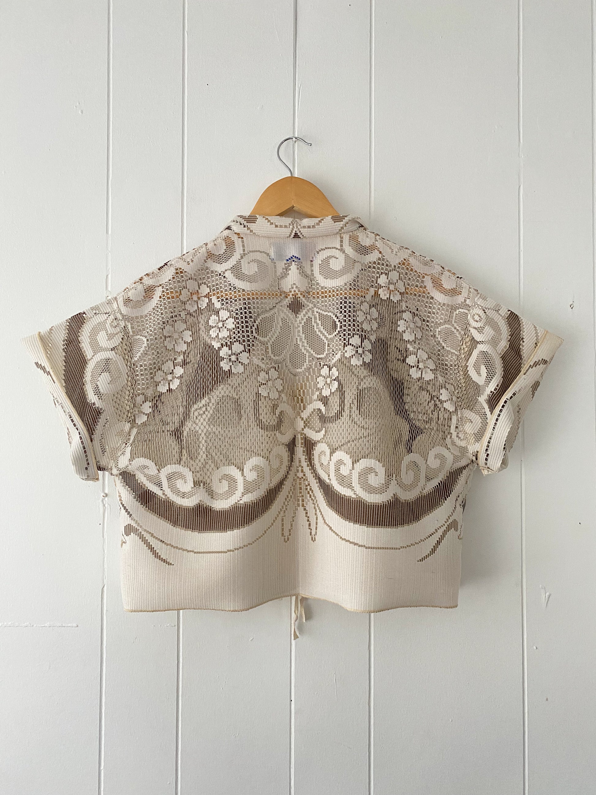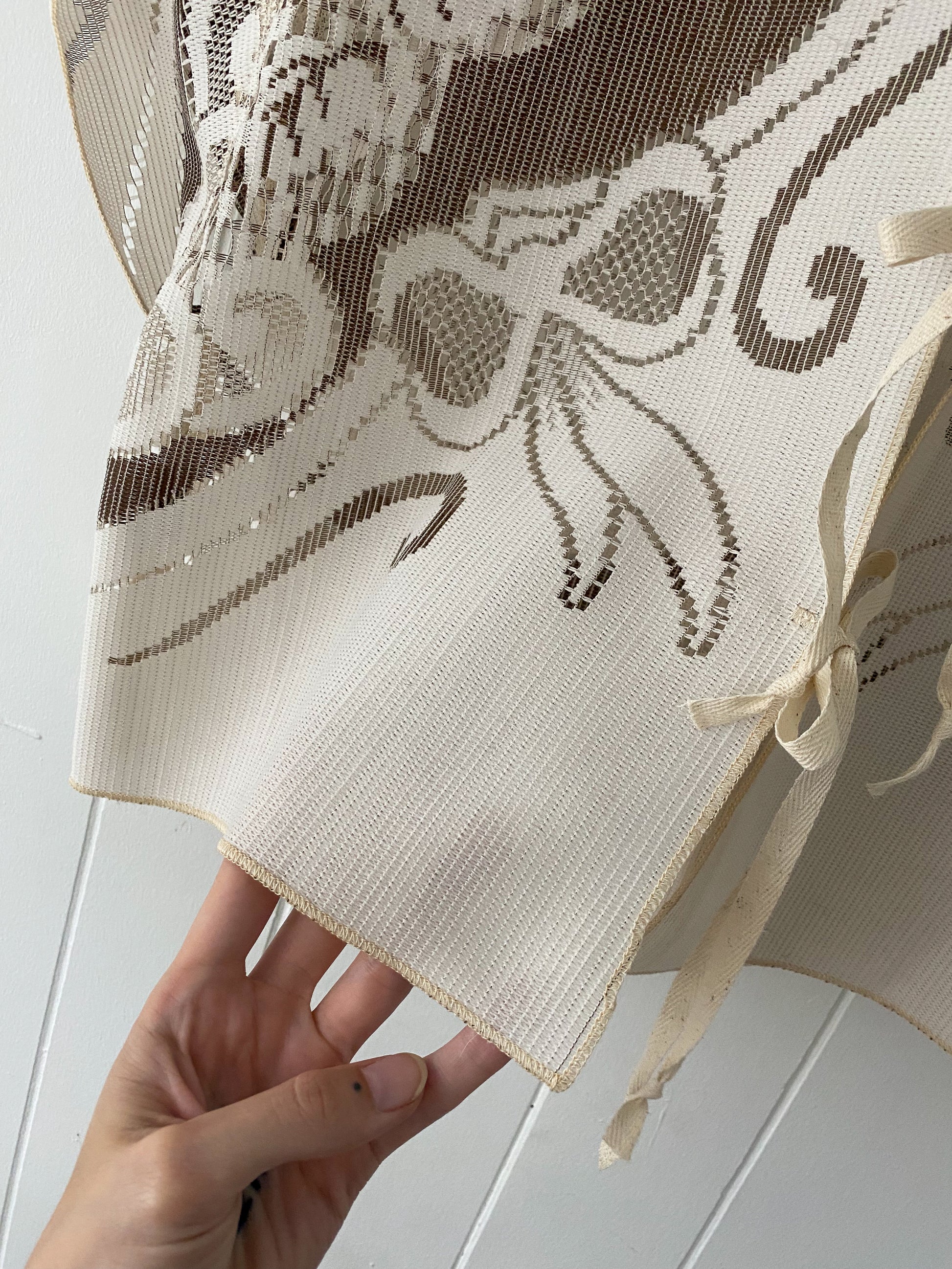 2 ties close the front. Made from a structured vintage tablecloth. Boxy fit.